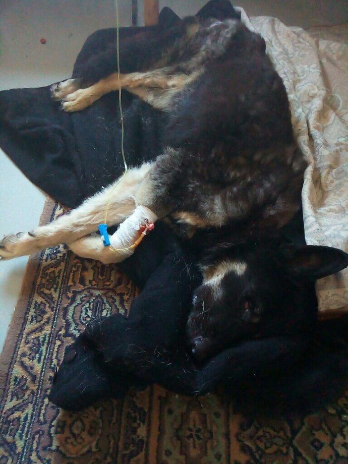 Ветеринар дал заключение, что собака парализована вследствие полученного удара, тяжелым предметом по голове, из этого ясно, что пес никак не мог убежать сам. Несмотря на такое состояние, врач дает благоприятные прогнозы и вскоре пес сможет снова встать на свои 4 ноги.