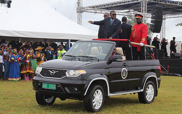 Кстати, на днях президент Намибии принял парад в честь Дня независимости страны на кабриолете УАЗ «Патриот», представленной Ульяновским автозаводом в 2017 г. От обычной версии она отличается отсутствием крыши, двумя дверьми вместо четырёх и отделкой салона кожей.