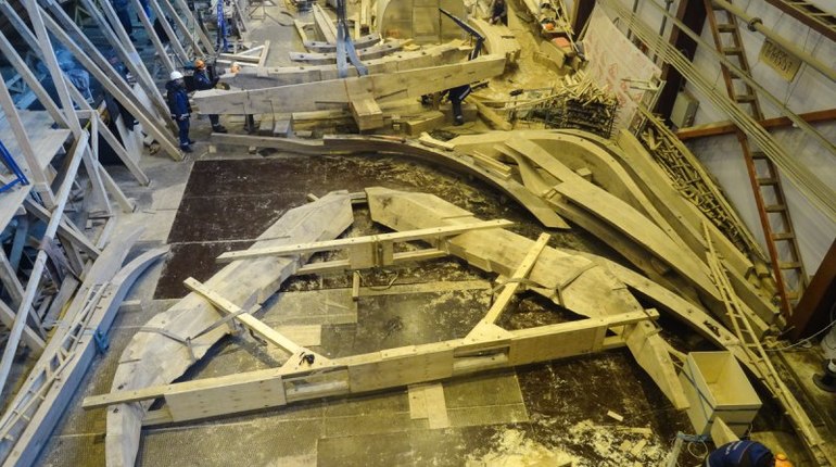 Корабль "Полтава" - первый линейный корабль Балтийского флота. На воду его спустили в 1712 году. Его строительство велось на Адмиралтейских верфях. На верфи исторического судостроения корабль воссоздают уже пять лет. Эта версия "Полтавы" будет только музейным экспонатом. При этом стоять на воде она будет без специальных подушек.