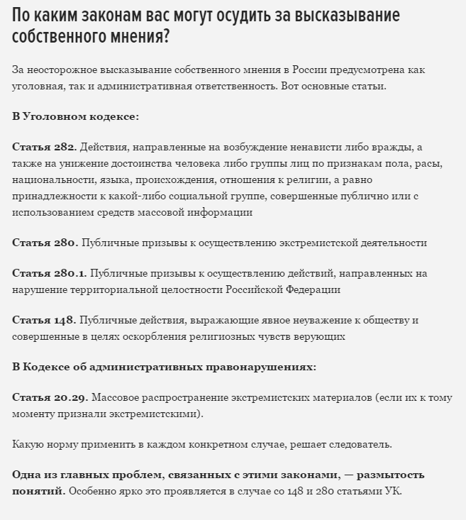 Эти уголовные дела были возбуждены по сравнительно новой статье №280.1 УК РФ «Призывы к осуществлению действий, направленных на нарушение территориальной целостности России», которая пополнила кодекс летом 2014 года. Нередко непродуманная активность в интернете попадает под 282-ю статью УК о разжигании межнациональной розни, и, как правило, эти обвинения не лишены оснований. Также могут применять и другие статьи, такие, как оправдание терроризма, расизма, нацизма, призывы к экстремистской деятельности, оскорбление чувств верующих и другие.