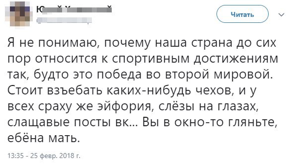 Комментарий в теме - не спортсмена!!! Другой бы понял!!! Спорт - это так же и политика!!!