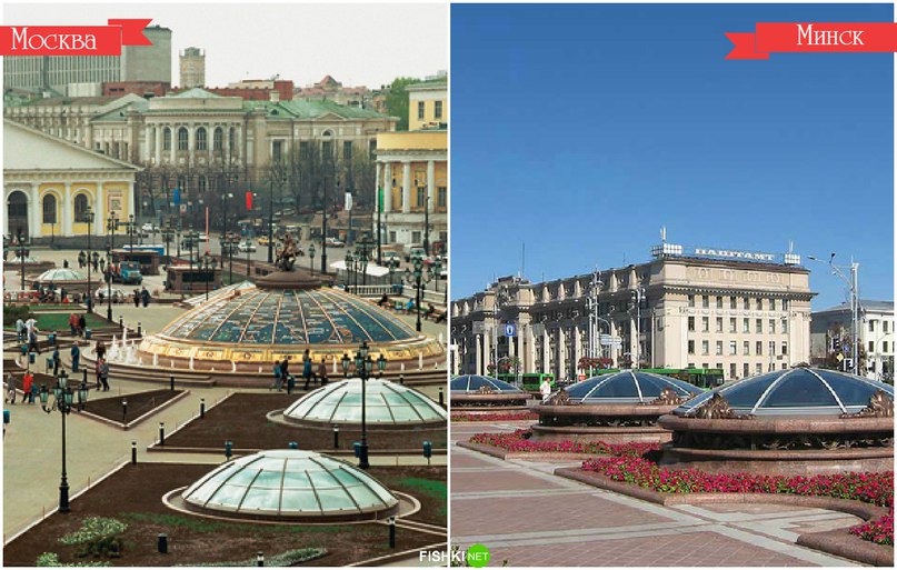 А вот в Минске москвич может легко перепутать Манежную площадь с площадью Независимости. А все из-за куполов торгового центра "Столица", который, наверняка, напомнит знаменитый "Охотный ряд".