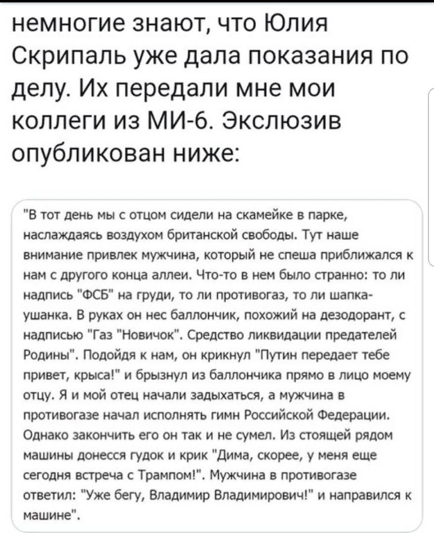 Владимир Путин: «Только что, как мне доложили, генеральный директор лаборатории в Портон-Даун, что в восьми километрах от того места, где произошел инцидент, сообщил в интервью Sky News, что сотрудникам его лаборатории не удалось установить страну происхождения этого нервно-паралитического вещества, и они не могут идентифицировать страну происхождения, в том числе не могут сказать, что это вещество было произведено в Российской Федерации».