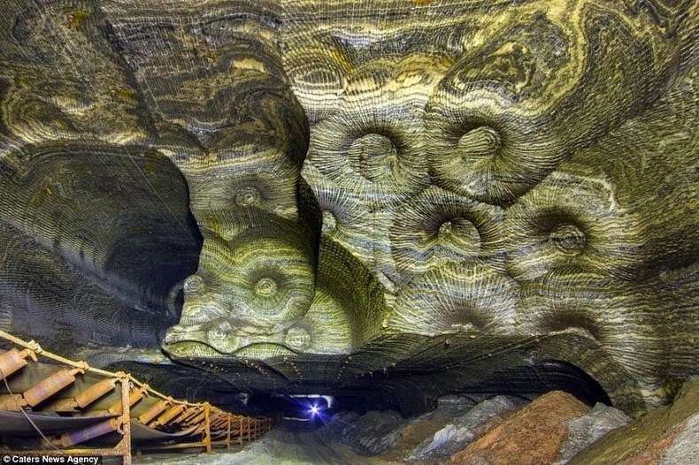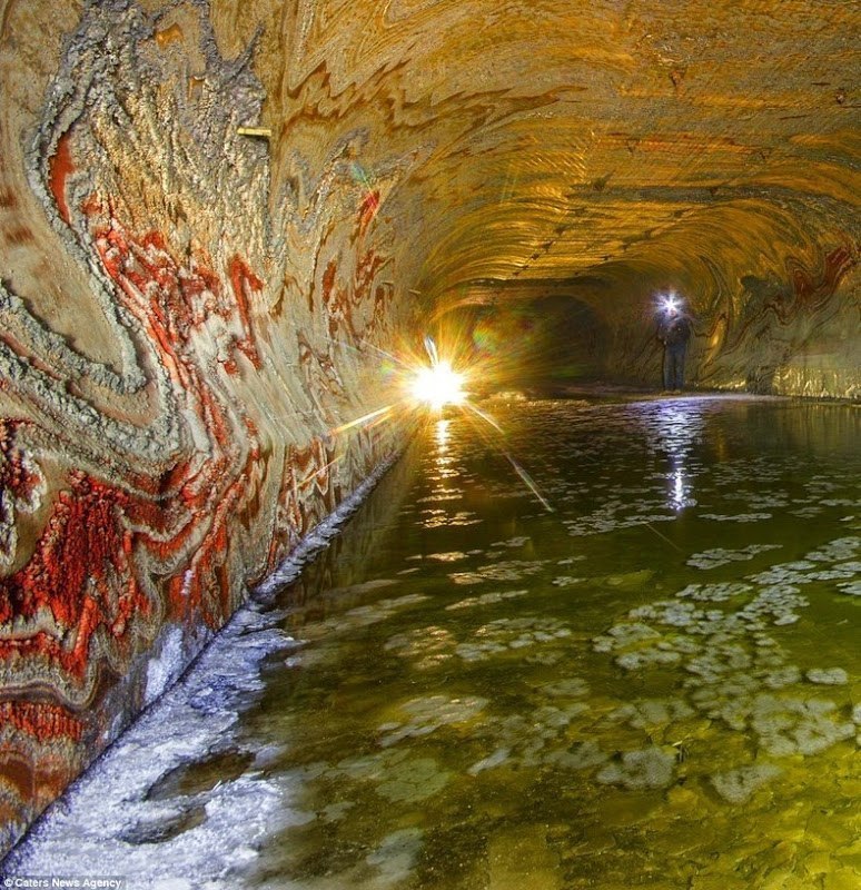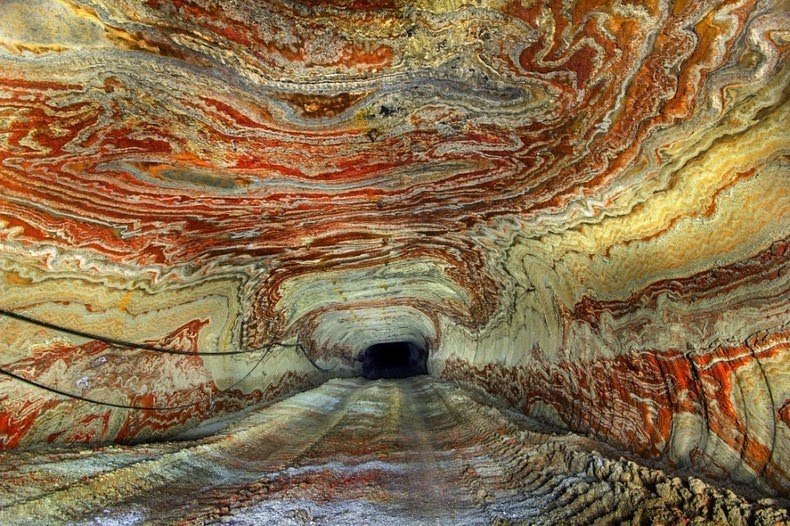 Большая часть шахты уже давно не используется, но в некоторых местах все еще идет добыча карналлита - минерала, который используется в сельском хозяйстве, как удобрение. Именно из-за него стены шахты приняли такой психоделический вид после бурения.
