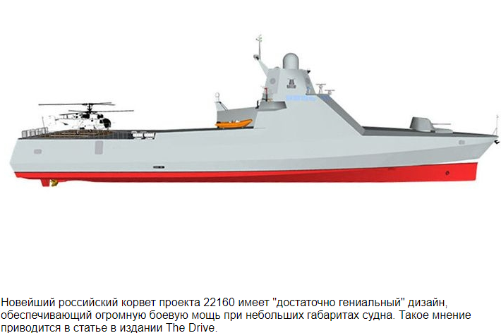 Новейший российский корвет проекта 22160 имеет "достаточно гениальный" дизайн, обеспечивающий огромную боевую мощь при небольших габаритах судна. Такое мнение приводится в статье в издании The Drive. В материале подчеркивается, что корабль создан по принципу модульности — вооружение и оборудование проекта 22160 может меняться в зависимости от задачи, будь то борьба с пиратством или поддержка крупных ударных операций. На корабле, помимо стандартной артиллерийской установки калибра 57 миллиметров, пулеметов и противодиверсионного гранатометного комплекса ДП-65, присутствует пустое пространство под вертолетной площадкой. Это помещение, отмечается в статье, может быть использовано для размещения двух ракетных комплексов "Калибр" (Club-K). Это, по мнению автора статьи, позволяет небольшим патрульным кораблям наносить удары восемью ракетами по морским и наземным целям на большом расстоянии. При этом автономность плавания кораблей проекта 22160 составляет два месяца, за это время может быть пройдено до шести тысяч морских миль, отмечает автор. "Этот концепт достаточно инновационный, чтобы его изучали в западных военно-морских силах. Он может послужить источником вдохновения для их многофункциональных боевых судов", — говорится в статье. Патрульные корабли проекта 22160 — патрульные корабли модульного типа дальней морской зоны, разработанные, строящиеся на Зеленодольском судостроительном заводе для ВМФ России. Главная задача кораблей этого проекта — охрана территориальных вод, борьба с пиратством, а также поддержка своих более крупных "собратьев" в бою. Ранее сообщалось, что к 2020 году в состав Черноморского флота планируется принять четыре корабля проекта 22160 — "Василий Быков", "Дмитрий Рогачев", "Павел Державин" и "Сергей Котов".