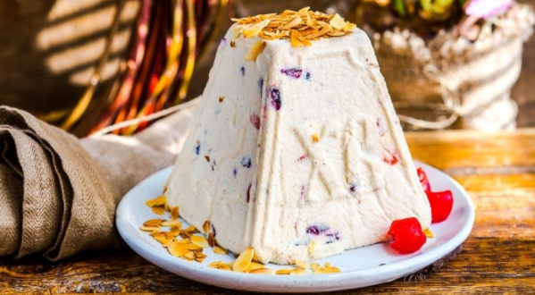 6. Выложить пасху в форму, выстеленную мокрой марлей (мокрой, чтобы не образовывались складочки), сверху накрыть чем-нибудь и придавить грузом. Форму установить в тарелку, чтобы стекала сыворотка. Оставить пасху в холодном месте на 10-12 часов. Затем выложить творожную пасху из формы и украсить цукатами.
