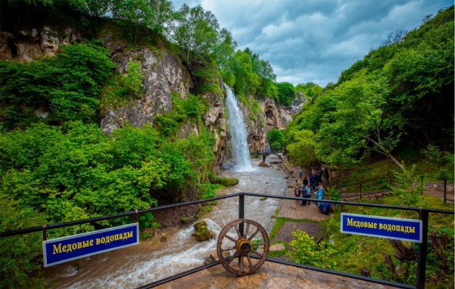 Пройдя от "Замка коварства и любви" по ущелью 6-7 километров можно увидеть отвесные скалы, с которых низвергаются так называемые Медовые водопады. Здесь действительно шикарные места. Горные ручейки и речки образуют сразу несколько шикарных водопадов. Они все такие разные, что утвердительно сказать, кто из них красивее сложновато