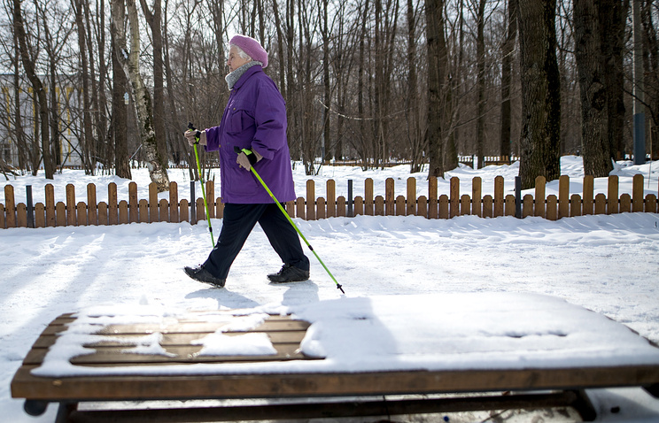 Сначала — разминка прямо в парке: ноги на ширине плеч, палки в вытянутых руках, наклониться, присесть… А уже потом — прогулка. "Мама очень серьезно относится к процессу, у нее такое лицо сосредоточенное, — говорит Татьяна. — Мама, улыбайся!"