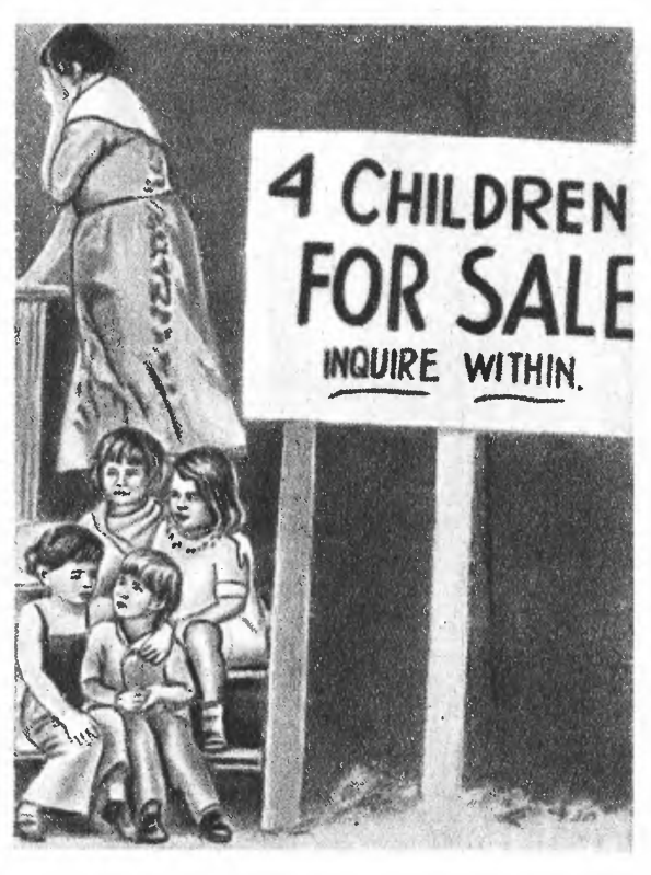 На другом итальянском острове, Сардинии, детвора трудилась на обогатительных фабриках, перерабатывавших руду, содержавшую свинец. По 8-10 часов дети находились по колено в стоячей холодной воде огромных ванн, в которых промывали минералы. В результате редкий ребёнок выдерживал более 2 лет такого труда, так как из-за ревматизма и отравления свинцом умирало и превращалось в инвалидов около 70% маленьких каторжников. Продажа детей объявлениеНо капиталистов не удовлетворяло даже то, что они могут жестоко и безнаказанно эксплуатировать детский наемный труд. Буржуазия стремилась и стремится заполучить миллионы маленьких безвольных и послушных рабов в частную собственность. Газета «New-York Journal and American» № 57 за 1952 год опубликовала заметку «Children for sale» («Продаются дети») с фотографией, на которой показан кусок шумной улицы, убогое крыльцо, на котором сидят четверо малышей, и женщина, закрывшая руками лицо. Над детьми висит кусок фанеры с надписью: «Продаются 4 ребёнка, за подробностями обращаться сюда». Так безработные Рей и Люсил Шалиф, отчаявшись найти работу и истратив на еду все скудные накопления, решились на последнее средство спасения малышей от голодной смерти – на продажу своих детей. Мало кто знает, что в развитой и демократической Америке до 1962 года существовали целые агентства, скупавшие детей у нищих родителей, вроде супругов Шалиф, и перепродававшие свой «товар» по назначению: девочек, чаще всего, в подпольные притоны «коза-ностры», мальчиков – на заводы и фабрики крупнейших американских монополий. Эти агентства были запрещены именным указом президента Кеннеди[19], но после его убийства в ноябре 1963 года, они опять заработали и продолжали позорную торговлю «живым товаром» примерно до 1968 года – предположительно под крылышком ФБР[20]. (Таких агентств полно и в сегодняшней буржуазной России. Только продают они наших детей все больше иностранцам. Для каких именно целей, понятно из информации, данной выше автором настоящей статьи. Когда этот выгодный «бизнес» действующая власть попыталась хотя бы формально ограничить (пресловутый «Закон Димы Яковлева»), помните, какой поднялся вой? Громче всех выла либеральная оппозиция, хорошо показывая свою классовую физиономию. — прим. РП)