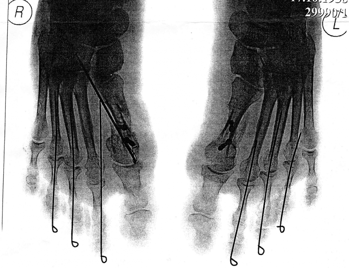 на правой стопе под рукой хирурга хрустнула другая косточка, ему пришлось вставить спицу для скрепления. Вторая была вынужденная по удалению этой спицы.