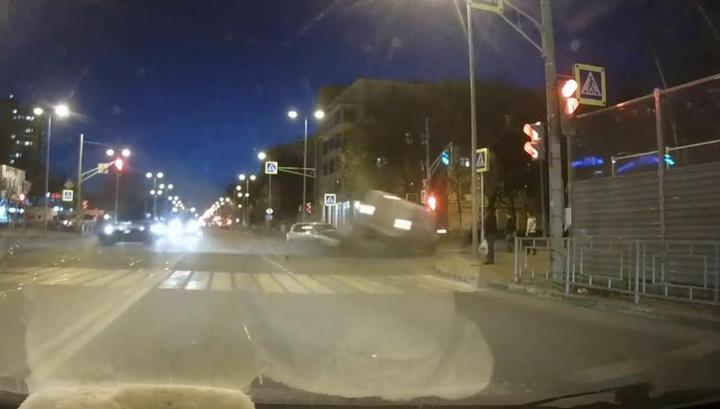 В Нижнем Новгороде столкнувшийся на перекрестке с легковушкой фургон Peugeot перевернулся и вылетел на тротуар, где буквально подмял под себя случайного прохожего. Камера регистратора запечатлела момент страшной аварии.