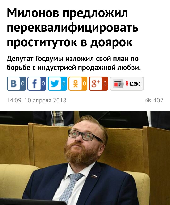 Дояркам срочно подать в суд на Милонова за оскорбление и не забыть про моральный ущерб в несколько миллионов.