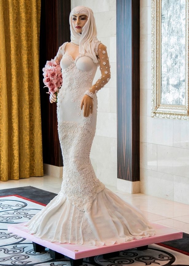 Невеста из бисквита в полный рост. Такой торт испекли специально для свадебной выставки в Дубае. Стоит он миллион долларов. Дизайнер проекта говорит, что старалась, что изделие выглядело, как настоящая арабская невеста. Правда, несмотря на хорошую фигуру, весит бисквитная красавица прилично — 120 килограммов. Для приготовления необычного десерта использовали тысячу яиц. Но главную ценность в торте представляют вовсе не съедобные детали.