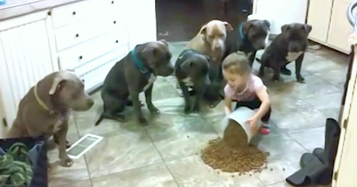 Легко понять, почему интернет пользователям кажется диким видео где маленькая девочка дает команды, а затем кормит, шесть крупных бойцовских собак.
