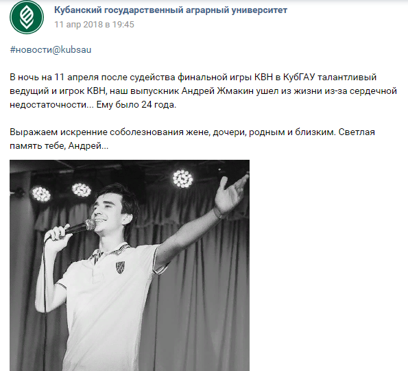 Участник шоу "Comedy баттл" и "Открытый микрофон" Андрей Жмакин умер от сердечной недостаточности. — В ночь на 11 апреля после судейства финальной игры КВН в КубГАУ талантливый ведущий и игрок КВН, наш выпускник Андрей Жмакин ушёл из жизни из-за сердечной недостаточности. Ему было 24 года, — написали в группе его университета в социальной сети "ВКонтакте". — Выражаем искренние соболезнования жене, дочери, родным и близким. Светлая память тебе, Андрей.