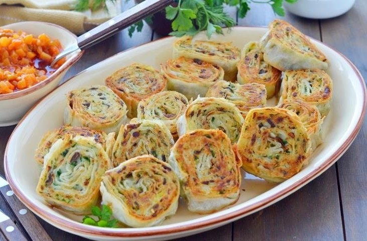 Лаваш с картофелем, грибами и зеленью (рулетики)