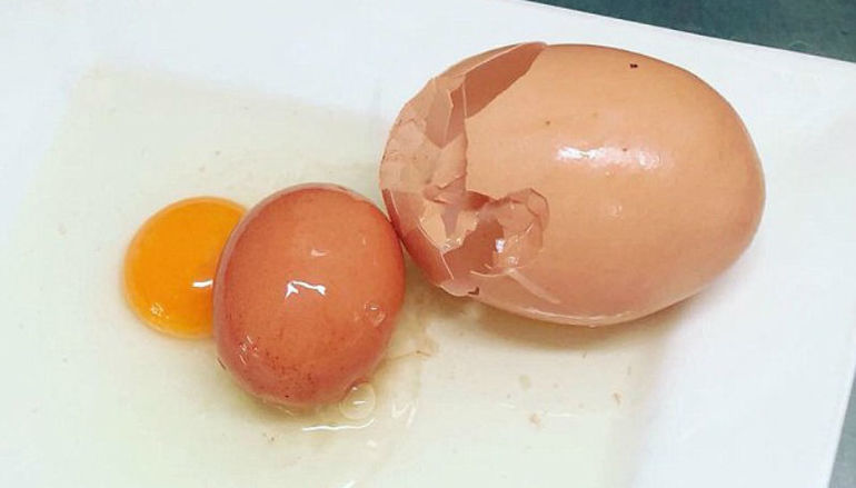 Скотт Стокман (Scott Stockman), владелец фермы, рассказал о небывалой находке – курином яйце весом 176 грамм и размером в три раза крупнее обычного. Еще больше фермеры удивились, когда разбили его пополам. Внутри, помимо положенного белка и желтка, оказалось еще одно яйцо поменьше.