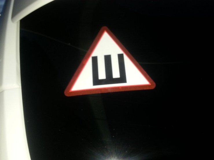 Зимой, с точки зрения ПДД, знак «Ш» на корме авто означает, что его водитель предлагает следующему сзади авто держать увеличенную дистанцию, поскольку вроде как считается, что «на шипах» машина тормозит лучше и следующий сзади может ее «догнать». Летом же, если следовать логике, знак «Шипы» говорит, что машина обута в зимнюю шипованную резину. То есть ее водитель сообщает всем окружающим, что нарушает ПДД, управляя машиной, «обутой» не по сезону.