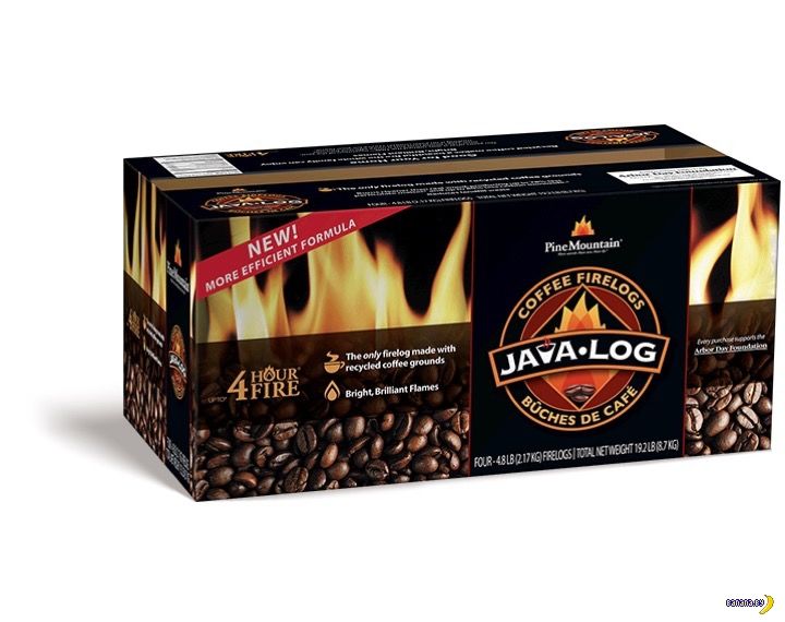 А американцы знают толк в бизнесе! В штатах люди пьют очень много кофе, причем там огромное количество кофеен, где продается кофе и кофейные напитки навынос. Разумеется, остаётся огромное количество кофейного жмыха, который выбрасывать жалко. Кто-то упаковывает и продает его в качестве органического (и дорогого!) удобрения, а самые хитрые тут придумали ещё одну идею. Жмых прессуется в небольшое полено, которое потом можно сжечь в камине вместе с обычной древесиной. Зачем? Под катом!