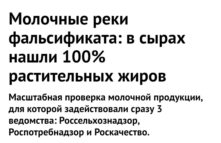 В России могут запретить продажу и производство сыроподобной продукции. Речь идет о сырах, которые изготовлены не из молока, и содержат от 50 до 100 процентов растительных жиров. Об этом "Известиям" сообщили в министерстве сельского хозяйства. Ведомство подготовило поправки в технический регламент, в которых предполагается прописать все требования к молочной продукции. В Минсельхозе уверены, многие предприятия в погоне за прибылью заменяют молоко более дешевыми растительными продуктами. При этом на упаковке такая информация либо не указывается вообще, либо печатается мелким шрифтом. По словам специалистов, такая ситуация наносит серьезный ущерб как фермерам, так и потребителям. Масштабная проверка молочной продукции, для которой задействовали сразу 3 ведомства: Россельхознадзор, Роспотребнадзор и Роскачество, — показала, что доля фальсификата на рынке просто огромная.