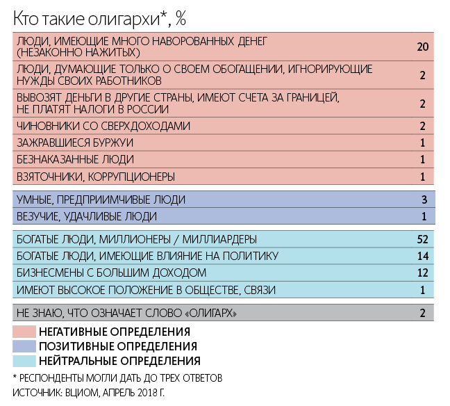 Вероятно, одна из причин радикального отличия во взглядах в понимании термина «олигарх». Сегодня в представлении большинства обывателей статус олигарха связан в первую очередь с размером богатства, это практически синоним миллионера и миллиардера, и в куда меньшей степени – с близостью к власти и большим политическим на нее влиянием. Такое понимание термина было характерно для второй половины 1990-х – первой половины 2000-х, его же, вероятно, и сейчас придерживается Песков. Тогда и известность, и антирейтинг тех, кого россияне считали олигархами, были тесно связаны с их близостью к власти и активностью в политике, часто непубличной. Сейчас к классическому определению олигарха как представителя узкого круга влиятельных и богатых людей склоняется лишь каждый седьмой. В конце 2010-х сугубо отрицательная коннотация в значительной степени размылась, считает гендиректор ВЦИОМа Валерий Федоров: теперь это элемент не политического, а, скорее, бизнес-ландшафта.