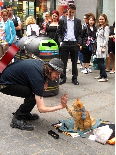 Бродячий музыкант Джмеймс не смог просто так пройти мимо кота, у которого была большая окровавленная рана на лапке. Он отнес животное к ветеринару, выходил его. Кот хоть и был бродячим, однако уходить от Джеймса не захотел. Уличный музыкант тоже привязался к коту и назвал его Бобом. С тех пор они практически неразлучны. Пока Джеймс играет на гитаре, Боб сидит рядом в одном из своих симпатичных шарфиков и привлекает внимание прохожих. Кроме того, Боб научился паре трюков и заработок этой команды увеличился до 40 фунтов стерлингов в день. Конечно, Джеймс избавился от наркотической зависимости, а кот для него не просто питомец, это его лучший друг, его семья. Уличный кот по имени Боб Однажды среди прохожих слушателей Джеймса оказалась литературный агент Мария Панчос, которая, наверное, поддавшись очарованию зеленых глаз Боба, предложила Джеймсу описать их историю на бумаге. Вскоре Джеймс действительно написал книгу «Уличный кот по имени Боб», которая стала в Британии бестселлером. В книге Джеймс описал историю их трепетной дружбы с Бобом, а также поведал много занимательных историй, которые приключились с ними на улицах Лондона. Книга переведена на 18 языков и Джеймсу даже уже поступают предложения снять фильм по этой книге. Однако Джеймс расставаться с привычным ему способом жизни не спешит, играя на улицах, он действительно счастлив. Боб тоже выглядит довольно счастливым, он теперь всеобщий любимец лондонской публики, работники метрополитена даже презентовали коту бесплатный проездной.