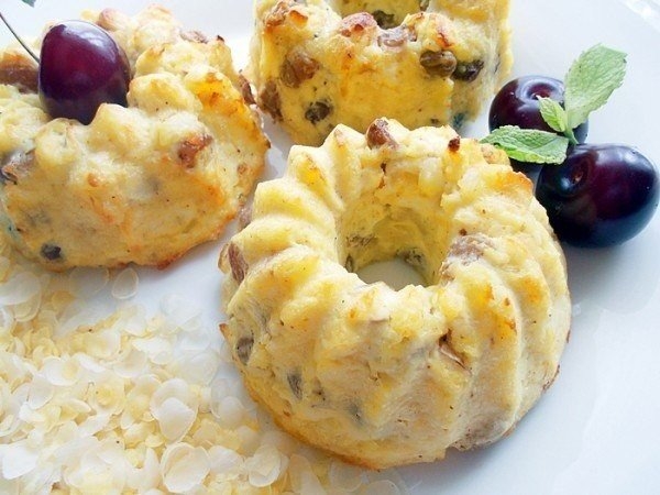 Вам потребуется: творог - 250 г (вкуснее всего из жирного, домашнего), яйцо куриное - 1 шт, хлопья или отруби - 5 ст.л., изюм - 7 ст.л. (предварительно замоченный в кипятке или в ароматном чае), цедра цитрусовых - по вкусу, специи - по вкусу (молотые корицу и имбирь).