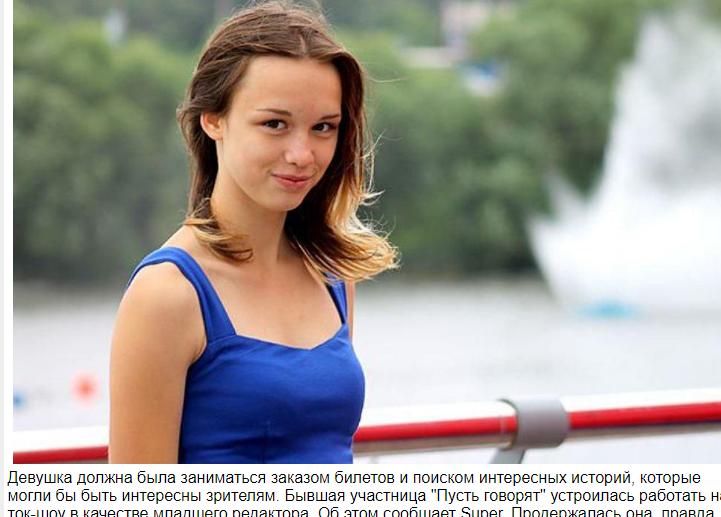 Девушка должна была заниматься заказом билетов и поиском интересных историй, которые могли бы быть интересны зрителям. Бывшая участница "Пусть говорят" устроилась работать на ток-шоу в качестве младшего редактора. Об этом сообщает Super. Продержалась она, правда, недолго — всего три дня. В обязанности Дианы входили заказ билетов и поиск таких же интересных тем, как её. Отмечается, что зарплата её могла составлять около 35 тысяч рублей в месяц. Ранее Лайф сообщал, что Диана Шурыгина, которая стала известна на всю страну после того, как рассказала о своём изнасиловании во время вечеринки на даче (куда сама поехала), записала песню. Она выступила дуэтом с исполнителем Сашей Актом. По звучанию трек получился на стыке "Фактора 2" и "Многоточия". Шурыгина обвинила Сергея Семёнова в изнасиловании на вечеринке. Изначально молодого человека отправили в колонию строгого режима на восемь лет, позже суд изменил срок на три года и три месяца, заменив строгий режим на общий. 10 января Семёнов покинул колонию по УДО. История получила широкий общественный резонанс. Диана Шурыгина рассказывала во время программы, что выпила немного ("на донышке") и что над ней надругались.