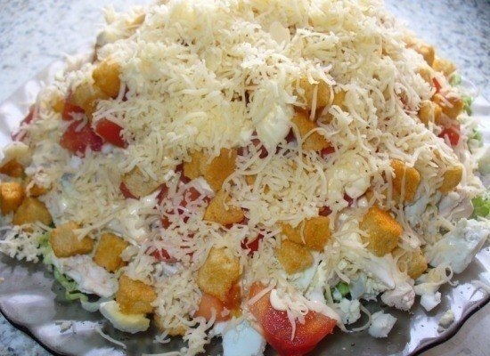6. Затем идет слой сухариков, который нужно смазать тонким слоем майонеза. Натираем сыр через мелкую терку и обильно посыпаем салат. Отправляем салат с курицей, сыром и сухариками в холодильник на 60 минут.