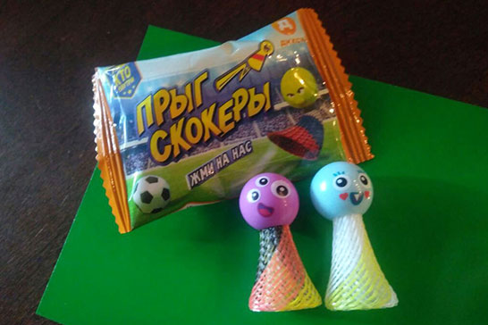 Акция приурочена к Чемпионату мира по футболу, который впервые пройдет в этом году в России. Прыг-скокеры — это прыгучие мячики, которые «выстреливают», если на них нажать. На кассе можно будет получить игровое поле — листовку-мишень, в которую и нужно «стрелять». Очки начисляются в зависимости от того, куда попал мячик, так что выходит полноценная игра, в которую можно резаться дома и на переменах. В общем, думаем, это будет новый «бум». Ну, надеемся, хоть до драк не дойдет.