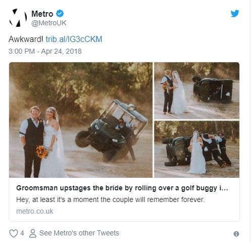 Для этого он сел за руль гольф-кара и проехался пару раз позади молодоженов. Но в один момент он не справился с управлением и просто перевернулся вместе с машиной. Это и попало на свадебные снимки, которые позже разлетелись по всему интернету.