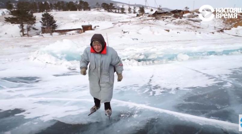 Мировые СМИ очарованы пенсионеркой, катающейся по озеру Байкал на самодельных коньках.