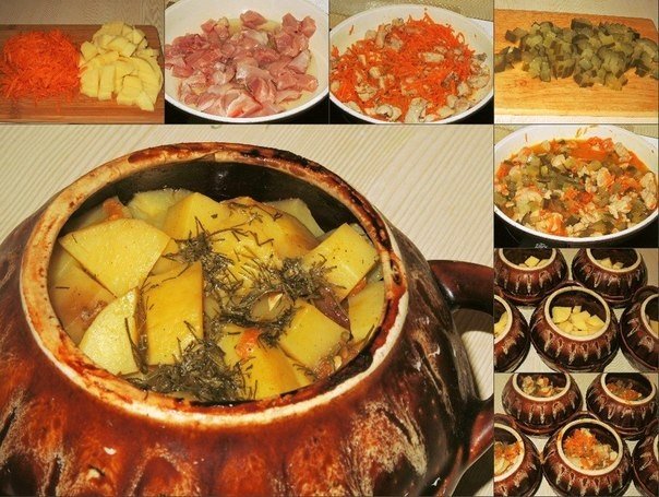 На дно горшочка укладываем картошку, потом мяско, затем опять картошку.