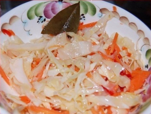 2. В кастрюлю залить все компоненты для маринада и всё прокипятить 5 мин. Залить кипящим маринадом капусту.