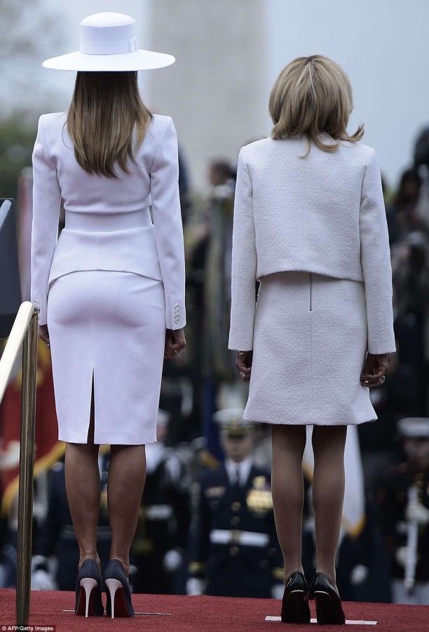 Одинаковые наряды не только не уравняли первых леди – они заметно подчеркнули недостатки мадам Макрон на фоне модельной внешности Мелании. И если быть честной до конца, то бороться тут не за что и нечем – 20 лет разницы это слишком много для того, чтобы иметь хоть один шанс на победу.