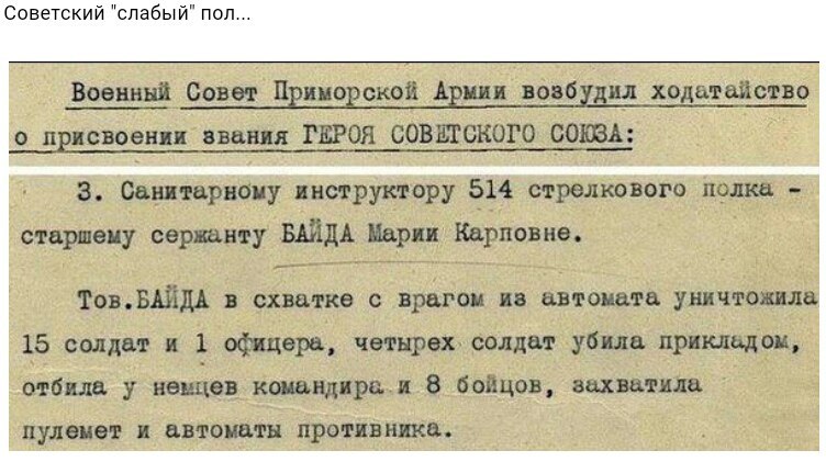 Это что! Повариха Кочедыкова Перепетуя Игнатьевна протаранила своей полевой кухней 11 немецких танков "Тигр", уничтожила половником 173-х до зубов вооружённых фашистов и взяла в плен подвернувшихся ей под руку троих германских фельдмаршалов и захватила эшелон ценных трофеев, за что была лично поздравлена и награждена Генералиссимусом, подарившим ей свою любимую курительную трубку. Эту святыню она после войны хранила под иконами, а сама курила "козью ножку", и только по праздникам "Беломор".