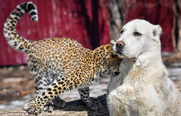 Известны случаи когда собака воспитывала кошку. А вот леопарда наверно впервые