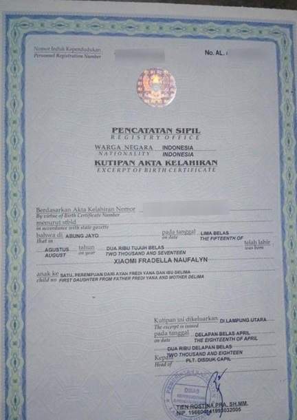 Свидетельство датировано августом 2017 года. В нем говорится, что Сяоми Фраделла Науфалин является первой дочерью отца Фреди Яана и матери Делимы.