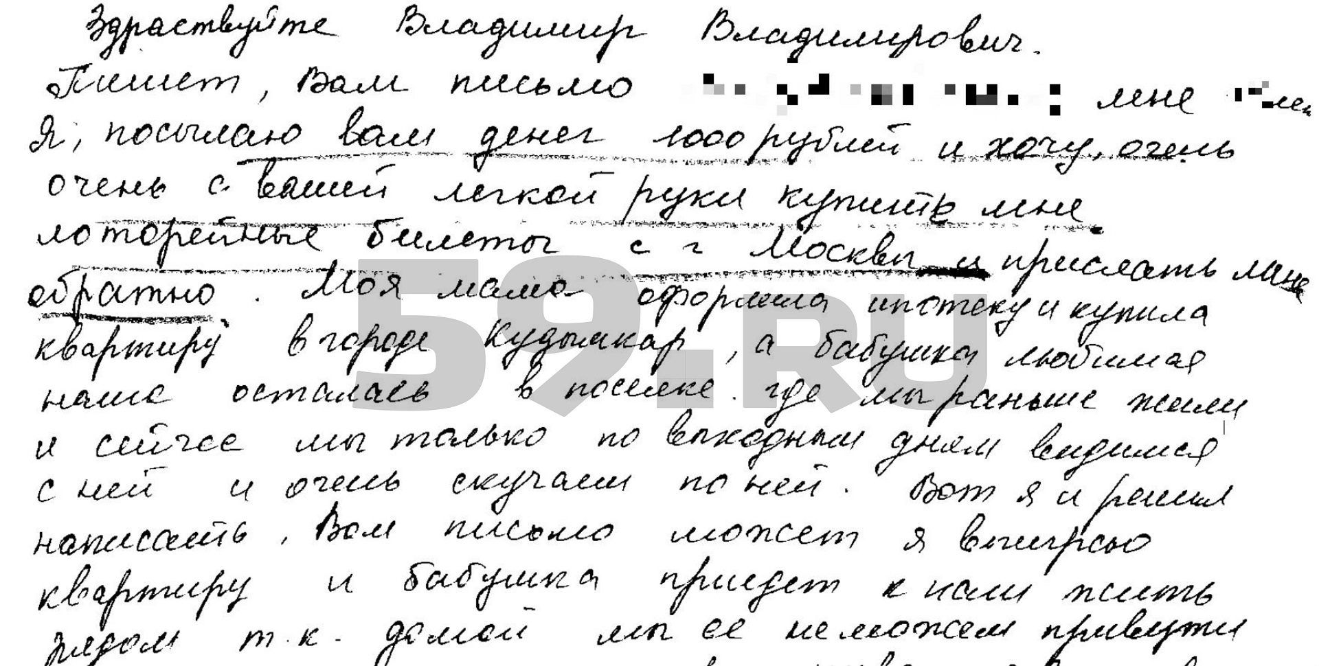 — Я посылаю вам денег и хочу, очень очень с вашей легкой руки купить мне лотерейные билеты с г. Москвы и прислать мне обратно, — написал ребенок (орфография и пунктуация сохранены. — Прим. ред.).