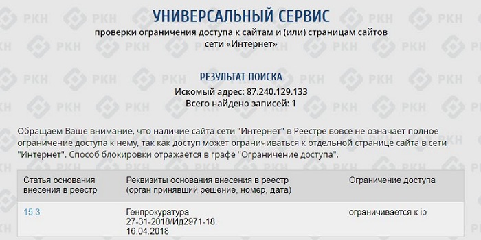 В частности, в список запрещенных включен один из IP-адресов «ВКонтакте» — 87.240.129.133. Данные на сайте Роскомнадзора подтверждают, что доступ к этому адресу ограничен, а поводом для блокировки стал запрос Генпрокуратуры.