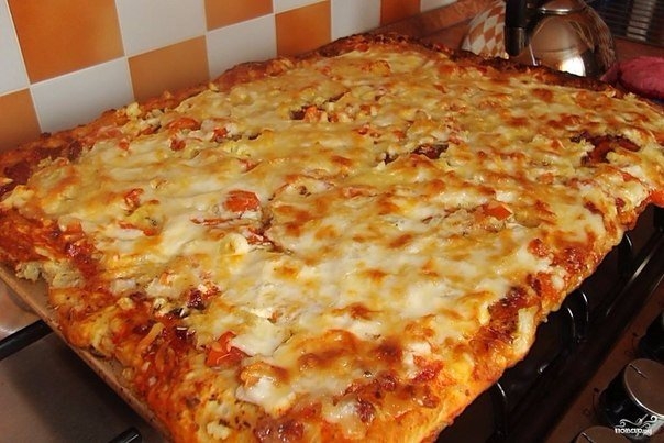 Затем щедро посыпаем пиццу слоем тертого сыра. При желании можно посыпать зеленью. Ставим в духовку, разогретую до 200 градусов, и запекаем пиццу до готовности - примерно 10-15 минут. Как только сыр расплавится, а тесто немного затвердеет, пиццу можно доставать из духовки.