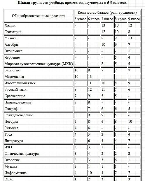 ШКАЛА ТРУДНОСТИ ПРЕДМЕТОВ В ШКОЛЕ