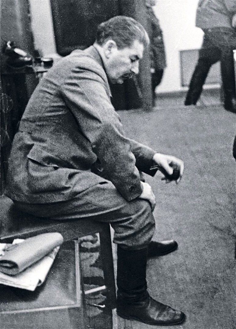 Это редкая фотография Сталина. Здесь он совсем другой, таким его, пожалуй, мало кто видел. Снимок этот, сделал фотограф из "Комсомольской правды", главный редактор, распорядился негатив и отпечатки уничтожить. Фотография сохранилась чудом: уборщица выносила мусорную корзину и фотограф случайно увидел в ней эту свою фотографию, забрал и сохранил... Точная дата и место не известны. Предположительно, это конец августа-сентябрь 41-го.