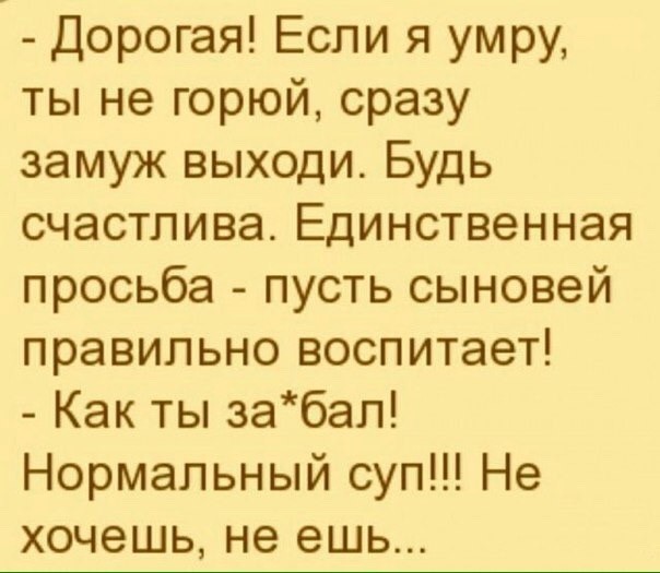 Бедный мужик! Видать долго не надеется протянуть на ее харчах,раз о смерти заговорил