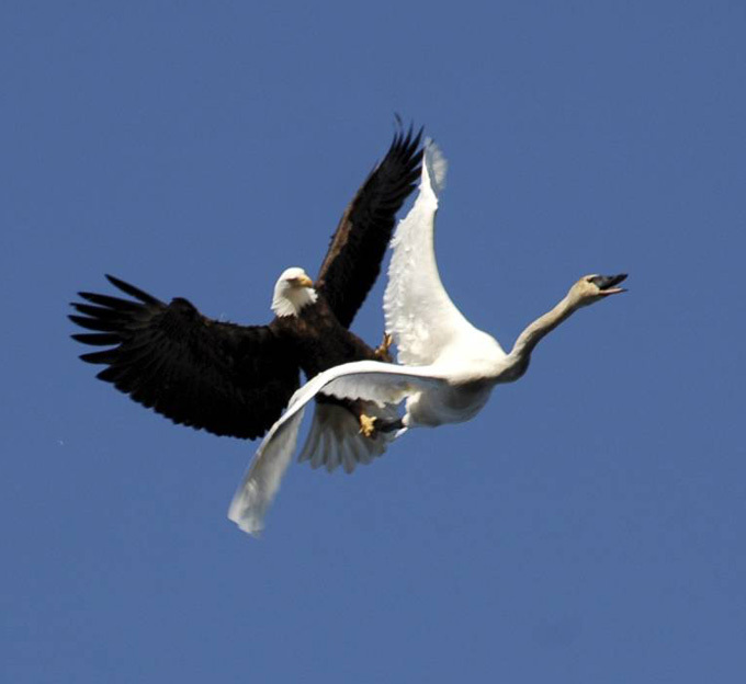 Этим воспользовался белоголовый орлан, который, как и положено хищным птицам, атаковал жертву сверху. Подобное нападение, казалось бы не оставило лебедю никаких шансов на спасение. Но... трубач не растерялся и не сплоховал. Он сразу же попытался скинуть хищника со спины, пока тот еще не вцепился в него крепко, и резко взмыл вверх