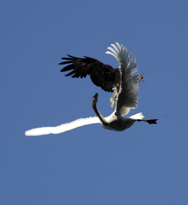 Однако это не помогло. Лебедь сразу же изменил тактику. Он также резко ушел вниз и... развернулся почти на 36 градусов. Этот маневр заставил орлана ослабить хватку.