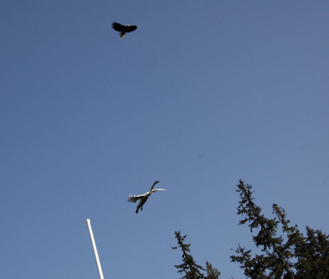 Камере фотографа-любителя из США Келли Мандей удалось запечатлеть захватывающую историю воздушного боя в абсолютно мирном небе над федеральным округом Британская Колумбия (США). Началось все с того, что лебедь-трубач торопился к себе домой и совершенно не смотрел по сторонам.