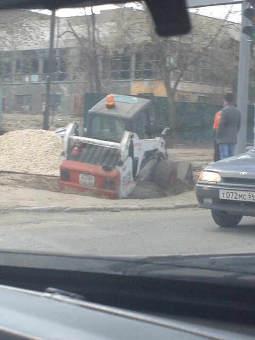 В Ленинском районе Саратова 30 апреля мини-погрузчик провалился под асфальт. Соответствующие фотографии очевидцы разместили в социальной сети «ВКонтакте».