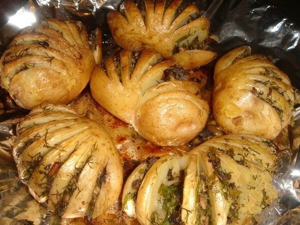 Если картофель молодой, хорошо промыть и не очищать. В каждой картошке сделать глубокие надрезы (не прорезая до конца). В картошку, аккуратно отодвигая надрезанные пласты, вложить грибную начинку.