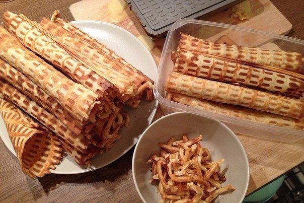5. Свежую вафлю можно свернуть в трубочку, рожок или просто сделать слоеный торт, смазав листы кремом или медом. Вафле необходимо придать форму сразу после выпечки, иначе она застынет и начнет ломаться.